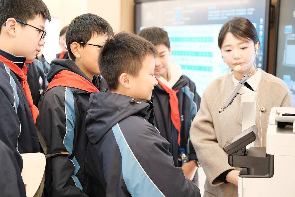 在科大讯飞的AI体验中心,学生们与人工智能互动,体验方言播报、多语种数字主播,感受前沿科技魅力。