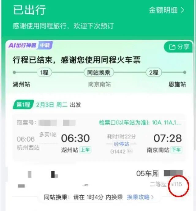 记者查询发现,G1442次列车的起点站是杭州西,发车时间是清晨6:06,途经湖州、宜兴、溧阳、南京南等,再经武汉、咸宁北、岳阳东抵达终点站长沙南,“我在湖州站上的车,大约一小时后到达南京南。”