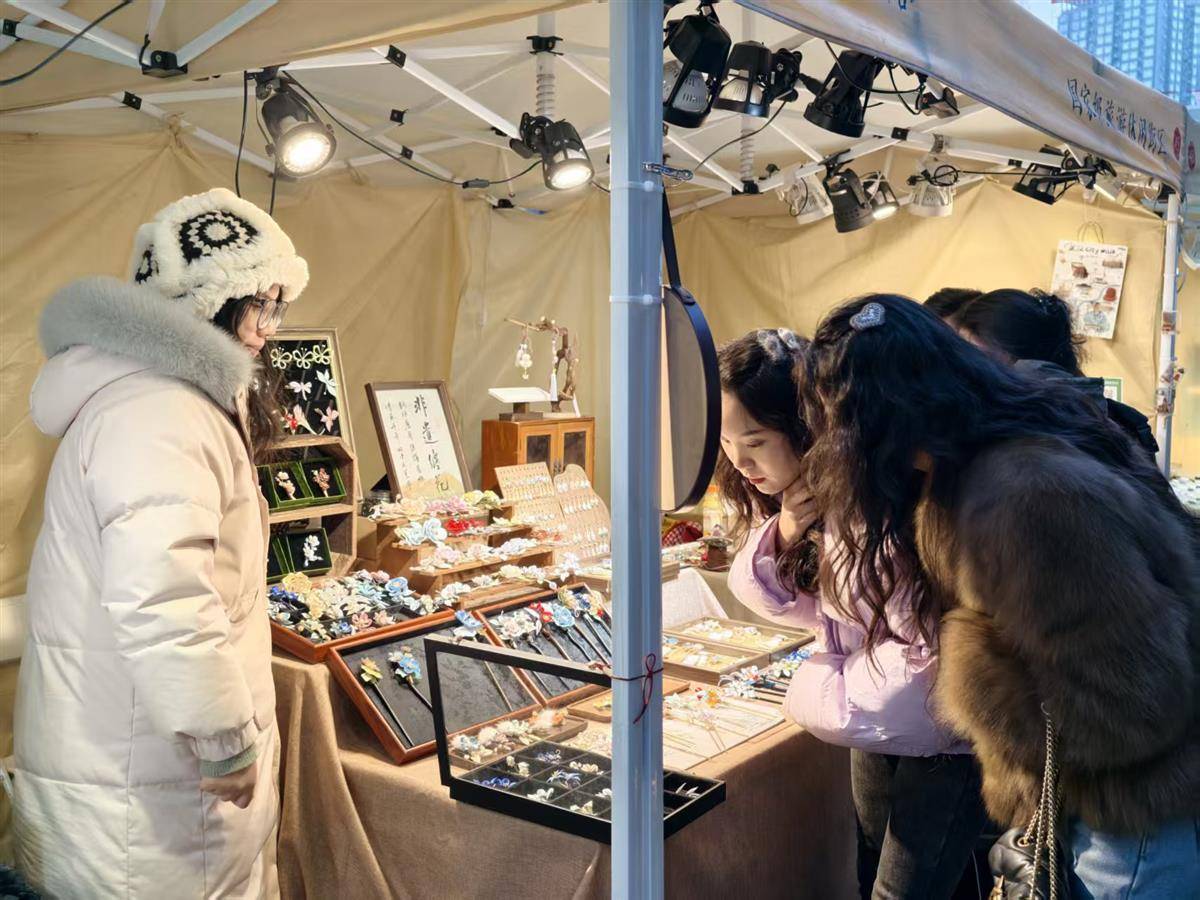 西安大学生小朱和男友在此驻足。他们因无直达车票而在武汉中转,特意来此“淘”年货。小朱挑了一支红梅缠花胸针和一枚花卉发卡,“给妈妈和姑姑的,比商场里的特别。”她爽快付了款。